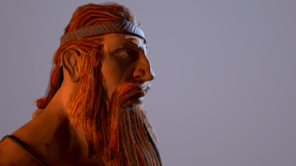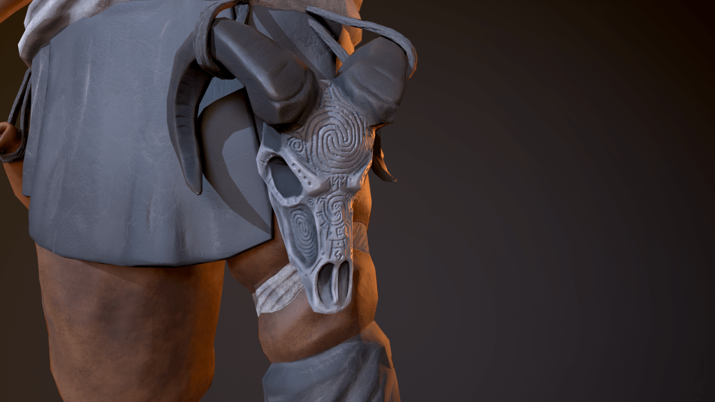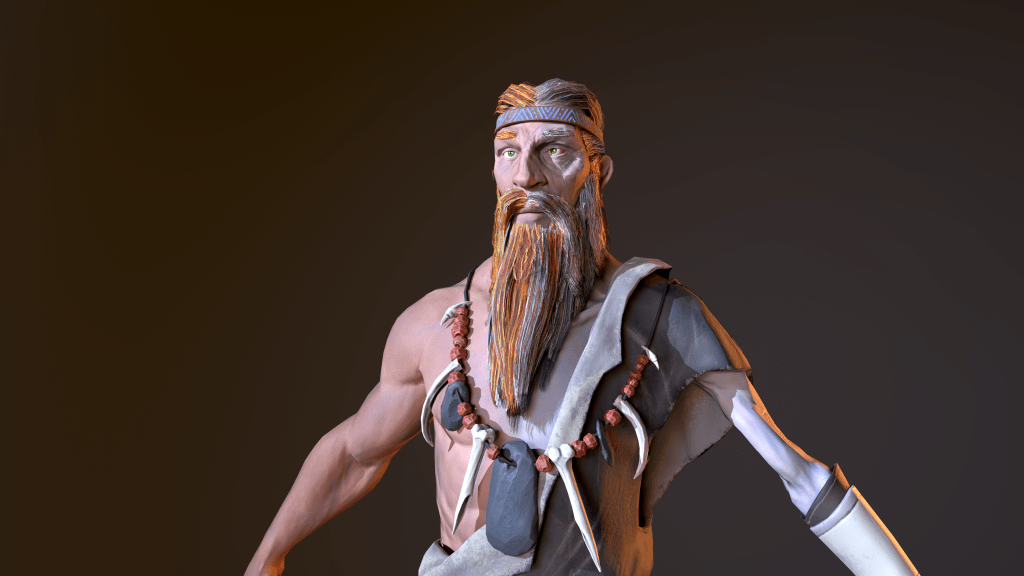 I created this character over the span of 4 weeks, from paper sketch to game ready model. I concept was to make make a stone age character who embodied the struggle of winter and the coming warmth of spring. He proved to be very challenging for me due to his totally asymmetric design. This was also my first time dabbling with hair cards, using particles to generate hair textures, and hair placement.